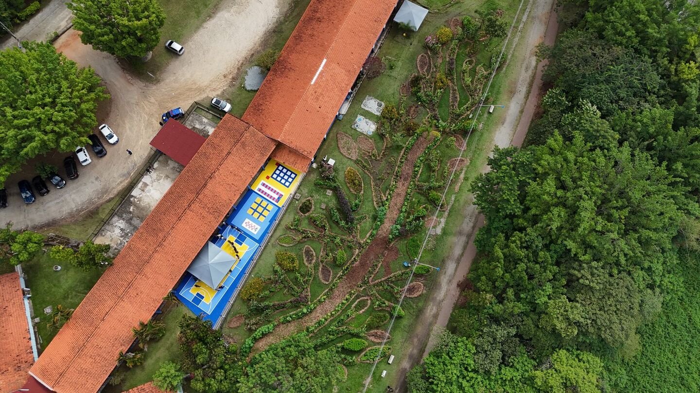 A obra de arte, no formato de árvore, está instalada dentro e ao redor da escola, ocupando 1.200 m². São 100 espécies plantadas, a maioria comestível, e 50 delas formarão hortas que, no futuro, darão lugar a uma floresta produtiva.