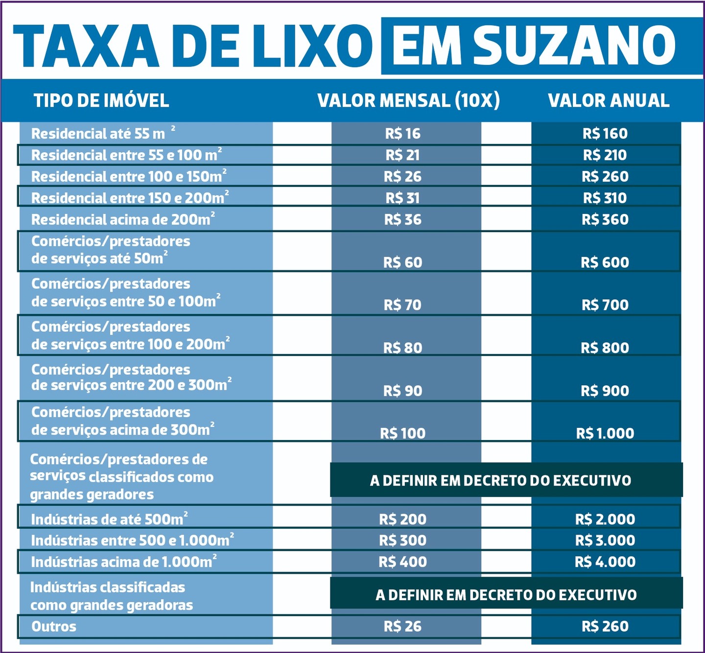 Em Suzano, a taxa será integrada ao Imposto Predial e Territorial Urbano (IPTU). Os valores variam de R$ 160 a R$ 4 mil por ano, dependendo do tipo e do tamanho do imóvel, variando de imóveis residenciais, comércios e serviços, indústrias e apenas terrenos.