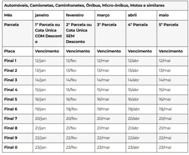 O pagamento segue o final da placa do veículo e pode ser feito à vista, com desconto de 3%, ou parcelado em até 5 vezes, de acordo com o valor do imposto devido.