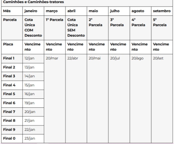 A tabela de pagamento para proprietários de veículos de carga é diferente. O pagamento pode ser feito, sem desconto, até 22 de abril, ou parcelado em até cinco vezes, com data fixada no dia 20 de cada mês.