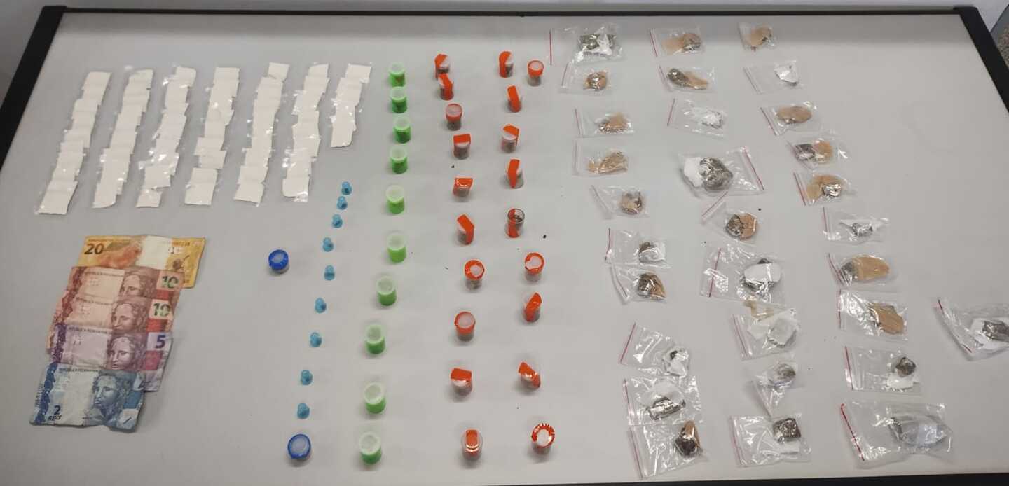 Após a abordagem, o indivíduo que havia descartado a sacola foi identificado e confessou aos agentes que realizava a venda de drogas. Na verificação do material apreendido, a equipe constatou a presença de 72 porções de maconha, totalizando 244 gramas, além de 66 de cocaína, com peso de 58 gramas, e a quantia de R$ 47 em dinheiro.