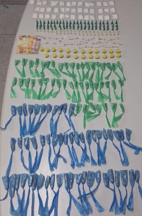 Durante a revista pessoal, foi localizada uma pochete com 190 porções de maconha, 94 de cocaína, 70 de crack e R$ 85. Os entorpecentes foram apreendidos.