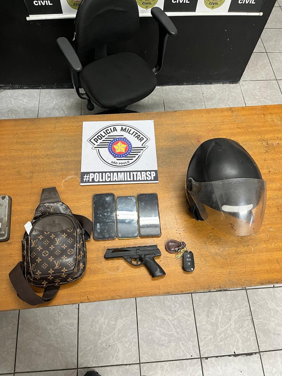 Um dos indivíduos foi abordado ainda no local, portando uma réplica de arma de fogo. Os outros dois suspeitos foram localizados e detidos nas proximidades.