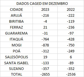 Em seguida aparece Biritiba Mirim, com saldo de 41 vagas de emprego ano passado e 138 em 2022, o que representa redução de 70,2%. Em dezembro o saldo foi de -4.