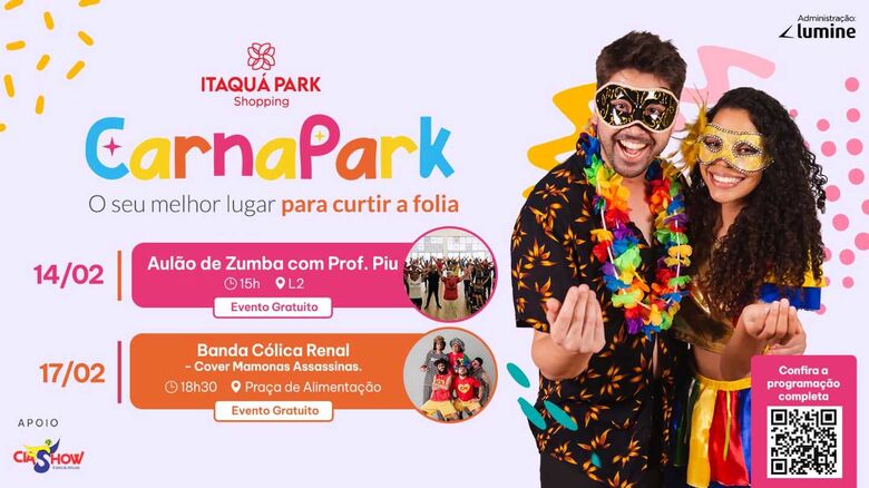 O Itaquá Park Shopping realiza, gratuitamente, o CarnaPark, evento de Carnaval voltado para toda a família, nos dias 14, 15, 16 e 17 de fevereiro. A programação inclui atividades para adultos e crianças, com atrações musicais, aulas de dança e brincadeiras infantis.